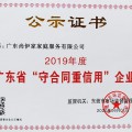 近日,广东省市场监督管理局公布了2019年度广东省“守合同重信用”企业名单。广东尚伊家家庭服务有限公司凭借良好的信用体系建设和规范的合同管理体系,顺利通过审核、社会公示,成功荣获2019年度广东省“守合同重信用”企业证书。这是我司三多年守法经营、诚信履约所获得的重要成果。“守合同重信用”企业的评选由市场监督